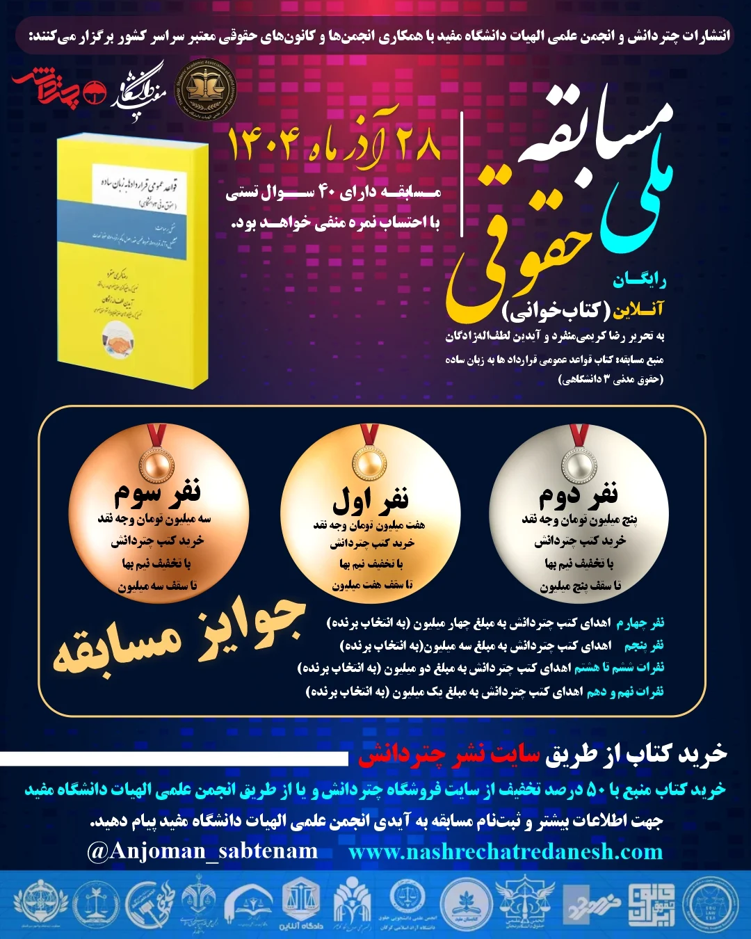 📔 منبع مسابقه: کتاب قواعد عمومی قراردادها به زبان ساده (حقوق مدنی ۳ دانشگاهی)🖋 به تحریر رضا کریمی منفرد و آیدین لطفاللهزادگان📄 مسابقه دارای ۴۰ سوال تستی با احتساب نمره منفی خواهد بود.🗓 تاریخ مسابقه: جمعه ۲۸ آذرماه ۱۴۰۴🟢شرکت در مسابقه برای عموم آزاد و رایگان است.