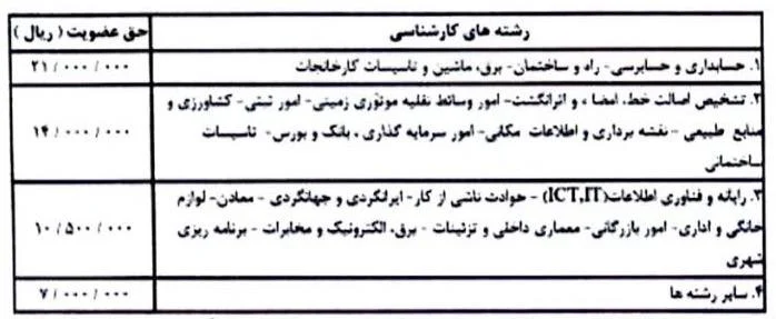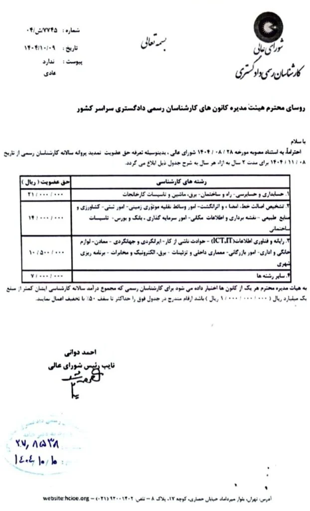 احتراماً به استناد مصوبه مورخه ۲۸ / ۱۴۰۴/۰۸ شورای عالی، بدینوسیله تعرفه حق عضویت تمدید پروانه سالانه کارشناسان رسمی از تاریخ ۱۴۰۴/۱۱/۰۸ برای مدت ۲ سال به ازاء هر سال به شرح جدول ذیل ابلاغ می گردد: