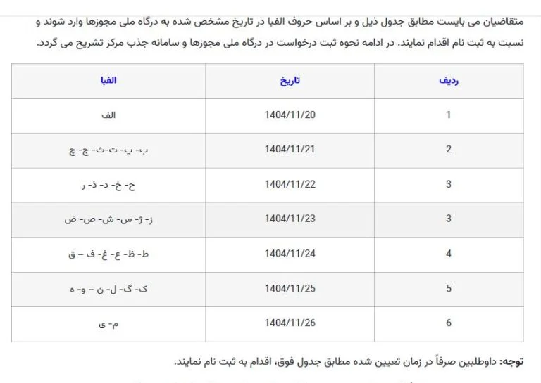 به اطلاع پذیرفته شدگان آزمون کارشناسان رسمی ۱۴۰۴(معوق ۱۴۰۲) می رساند؛ با پیگیری های صورت گرفته از طرف مرکز و رفع اختلالات ثبت درخواست در درگاه ملی مجوزهای کسب و کار، از روز دوشنبه مورخ ۱۴۰۴/۱۱/۲۰ امکان ثبت نام بر اساس زمانبندی مندرج در راهنمای ثبت نام، در درگاه ملی مجوزهای کسب و کار وجود خواهد داشت.